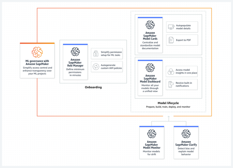 아마존 세이지메이커는 고객이 ML 모델 수명 주기 전반에서 거버넌스를 보다 쉽게 확장할 수 있도록 지원하는 새로운 기능을 제공한다. 조직 내에서 모델과 사용자 수가 늘어남에 따라 최소 권한 액세스 제어를 설정하고 모델 정보(입력 데이터 세트, 훈련 환경 정보, 모델 사용 설명, 위험 등급 등)를 문서화하기 위한 거버넌스 프로세스를 설정하기가 더 어려워졌다. 모델이 배포되면 고객은 편향과 피쳐 드리프트를 모니터링해 모델이 예상대로 실행되는지 확인해야 한다.