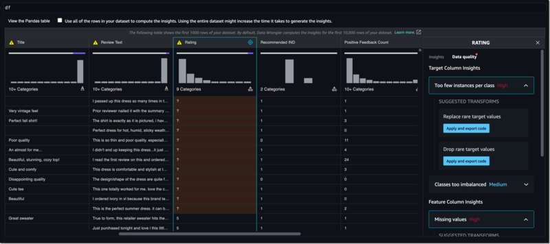 실무자는 훈련을 위해 데이터를 준비할 때 잠재적인 데이터 품질 문제(예: 정보 누락, 극단값, 왜곡된 데이터 세트, 편향)를 찾아 수정하기 위해 노트북에서 직접 데이터 세트를 탐색하기를 원한다. 실무자가 문제를 식별하고 수정하기 위해서 데이터 세트의 여러 부분을 시각화하고 검사하기 위한 보일러 플레이트 코드를 작성하는 데 몇 달이 소요될 수 있다. 이제 아마존 세이지메이커 스튜디오 노트북은 실무자가 몇 번의 클릭만으로 노트북 환경에서 직접 데이터 특성을 시각적으로 검토하고 데이터 품질 문제를 해결할 수 있는 데이터 준비 기능을 기본 제공한다. 사용자가 노트북에 데이터 프레임(데이터의 표 형식 표현)을 표시하면, 아마존 세이지메이커 스튜디오 노트북은 사용자가 데이터 품질 문제를 식별하는 데 도움이 되는 차트를 자동으로 생성하고 일반적인 문제를 해결하는 데 도움이 되는 데이터 변환을 제안한다. 실무자가 데이터 변환을 선택하면, 아마존 세이지메이커 스튜디오 노트북은 노트북이 실행될 때마다 반복적으로 적용될 수 있도록 노트북 내에 해당 코드를 생성한다.