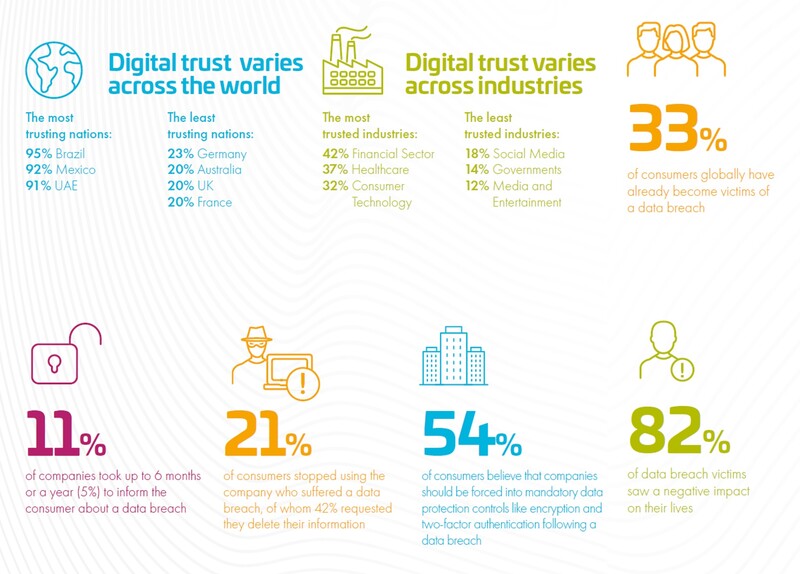 개인정보 보호에 대한 소비자들의 신뢰 수준은 국가별로 확연한 차이가 있었다. 개인정보나 디지털 서비스 보호 측면에서 독일(23%), 호주·영국·프랑스(20%)는 가장 낮은 신뢰도를 보인 반면, 브라질(95%), 멕시코(92%), UAE(91%)는 가장 높은 신뢰도를 나타냈다. 이런 국가별 신뢰도 수준 차이는 사생활보호권과 신뢰 결여에 대한 인식을 제고하는 개인정보보호규정(GDPR)과 같은 데이터 보호 규정의 결과로 해석된다.