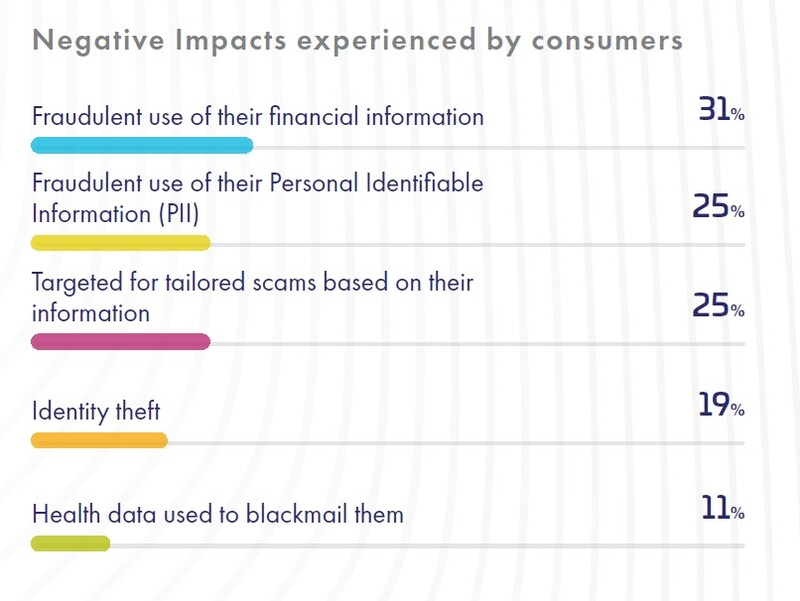 전 세계 소비자 대부분(82%)이 개인정보 유출이 자신들의 삶에 부정적 영향을 미쳤다고 답했다. 소비자들은 금융정보 부정사용(31%), 개인식별정보(PII) 부정사용(25%), 개인정보 기반의 맞춤형 신용사기(25%) 등이 가장 큰 부정적 영향이라고 지목했다. 한편, 전 세계 소비자들에게서 금융사기가 가장 높게 나타난 반면에 독일, 일본, 영국은 각각 31%(PII사기), 30%(ID절도행위), 25%(맞춤형 신용 사기)로 예외에 해당됐다.