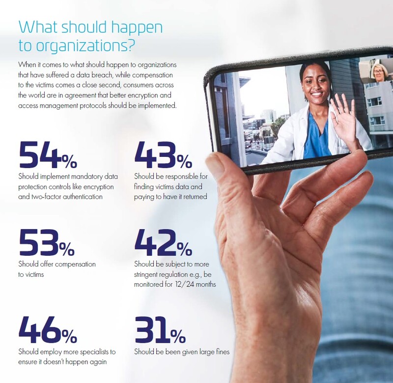 보고서에 따르면 전 세계 소비자들은 개인정보 유출피해를 받은 조직들이 향후 암호화나 이용자 인증 프로토콜과 같은 데이터 보안조치를 강화해야 한다고 답했다. 의무적으로 개인정보 보호책을 강화해야 한다고 답한 소비자가 절반(54%) 이상을 차지했고, 피해자 보상(53%), 재발방지를 위한 전문가 고용(46%), 유출정보 복구(43%), 더욱 엄격한 규정(42%)이 그 뒤를 이었다.