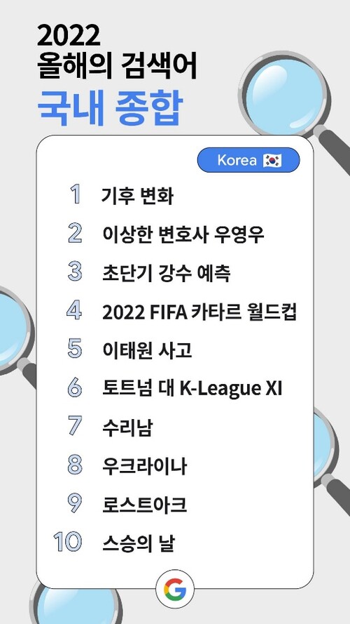 올 해 국내 이용자의 관심을 가장 많이 받은 검색어는 1)기후변화 2)이상한 변호사 우영우 3)초단기 강수 예측 4)2022 FIFA 카타르 월드컵, 5)이태원 사고 6)토트넘 대 K-League XI 7) 수리남 8)우크라이나 9)로스트아크 10)스승의 날 순이었다.
