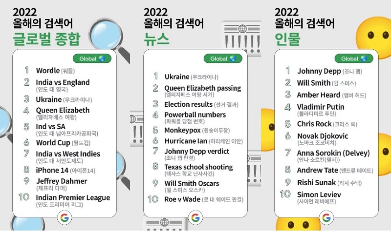 올해 글로벌 뉴스 분야에서는 1)우크라이나 2)엘리자베스 여왕 서거 3)선거 결과 4)파워볼 당첨 번호 5) 원숭이두창 6)허리케인 이안 7)조니 뎁 판결 8)텍사스 학교 난사사건 9)윌 스미스 오스카 10)로 대 웨이드 판결이 순위를 차지했다.
