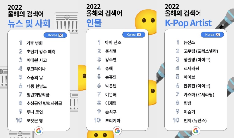 올해도 구글은 2022년 검색량에서 전년 대비 높은 증가를 보인 동시에 많은 관심을 받았던 분야별 국내외 검색어 트렌드를 소개하는 ‘올해의 검색어’ 를 발표했다. 올 한 해 국내 이용자들이 구글 검색에서 가장 많이 주목했던 검색어를 기준으로 ▲종합 카테고리 ▲뉴스 및 사회 ▲K-드라마 ▲영화 ▲게임 ▲인물 ▲K-Pop 아티스트 ▲스포츠 ▲축구 등 총 9가지 카테고리로 나누어 상위 10개씩 순위를 공개했다.