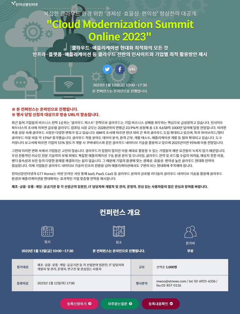 전자신문인터넷과 GTT KOREA가 공동으로 오는 1월 13일 금요일 "Cloud Modernization Summit Online 2023" 무료 온라인 콘퍼런스를 개최한다.