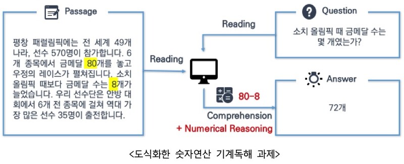 많은 수학적 문제는 수식이 아닌, 자연어로 기술되는 경우가 더 많다. 하지만 컴퓨터는 지금까지 수식만을, 그것도 컴퓨터가 인식할 수 있도록 변환해 제공해야 연산이 가능했다. 이런 자연어로 기술된 수식을 인공지능을 통해 컴퓨터가 이해할 수 있도록 만들기 위한 시도가 바로 '숫자연산 기계독해'이며, 사칙연산 등 숫자연산이 필요한 분야의 문서에 기계독해를 적용해 수치연산 질의를 통해 답을 찾아내는 인공지능 모델을 구축하기 위한 학습용 데이터가 바로 '숫자연산 기계독해 데이터'다.