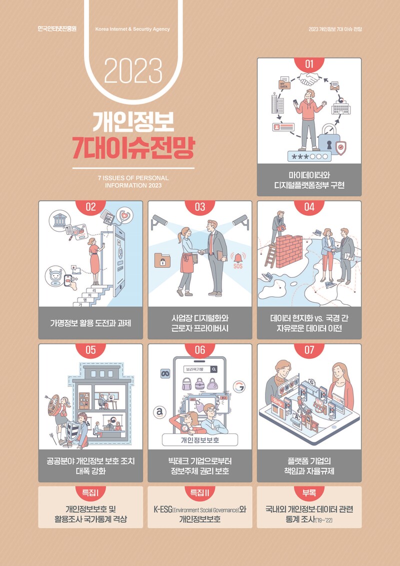 한국인터넷진흥원(이하 KISA)은 데이터 경제로의 패러다임 전환으로 중요성이 더욱 높아지고 있는 개인정보의 보호와 활용을 주제로 한 '2023 개인정보 7대 이슈'를 선정해 관련 보고서를 공개했다.