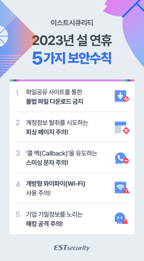 보안 전문 기업 이스트시큐리티(대표 정진일)는 사용자들이 안전한 설 연휴를 보내기 위해 꼭 지켜야 할 정보보안수칙 5가지를 18일 공개했다.