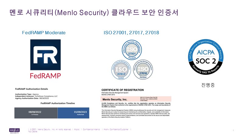 멘로시큐리티의 RBI 보안 솔루션은 GDPR(General Data Protection Regulation), FedRAMP, HIPAA(Health Insurance Portability and Accountability Act), ISO 27001(국제 표준 정보보호인증), ISO27017(클라우드 서비스 정보보호 관리체계), ISO27018(클라우드 서비스 개인정보보호 관리체계) 등의 다양한 국제 보안 표준을 충족하고 있어, 국내 공공 기관의 보안 요구 사항을 충족시킬 수 있다.