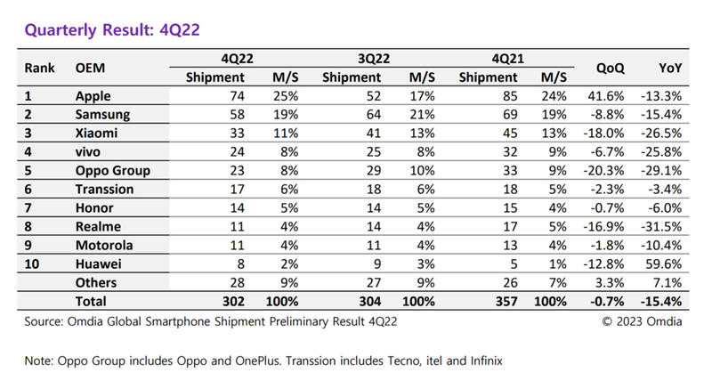 옴디아가 2022년 4분기 스마트폰 예비 출하량에 관한 보고서를 3일 발표했다. 옴디아에 따르면 4분기 전 세계 스마트폰 출하량은 총 3억 150만 대로 전년 대비 15.4% 감소했다. 일반적으로 4분기 출하량이 가장 많지만 올해는 전분기 대비 0.7% 감소하는 등 흐름이 역전됐다. 실제로 대부분의 브랜드들은 출하량이 두 자릿수 감소하는 등 전년 대비 큰 폭의 마이너스 성장을 기록했다.