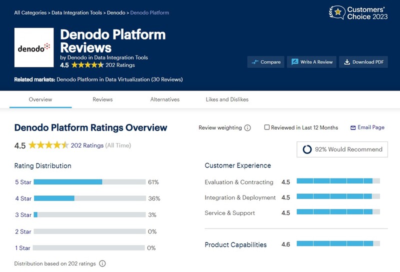 이에 최근 데이터 통합 도구 관련 솔루션에 대한 기업들의 관심이 높아지고 있는 가운데, 데이터 관리 기업 중 하나인 디노도(Denodo)가 데이터 통합 도구에 대한 '가트너 피어 인사이트(Gartner Peer Insights) 고객의 소리 2023년 1월 25일 보고서'에서 고객의 선택(Customers’ Choice)으로 선정됐다고 밝혔다.