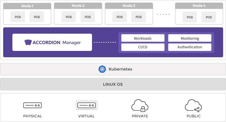 추가 개발 필요 없이 즉시 사용할 수 있다는 것을 장점으로 내세우고 있는 아코디언은 아코디언 이외에도 아마존 EKS, 마이크로소프트 AKS(Azure Kuberentes Service), VMware 탄주, 뉴타닉스 카본(Nutanix Karbon) 등과 같은 이기종 쿠버네티스에 대한 통합 관리와 애플리케이션 배포도 지원한다.