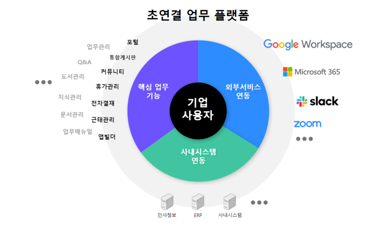 구글워크스페이스, 마이크로소프트 365와는 데이터 연결 기능을 제공해, 업무포털에서 관련 서비스를 바로 이용할 수 있도록 지원한다. 예를 들어 ‘구글워크스페이스’ 사용 고객은 지메일, 구글 캘린더, 구글 드라이브를 연동해 업무포털에서 사용할 수 있다. 업무포털 화면에서 지메일과 구글 캘린더 정보를 조회하고, 휴가정보를 구글 캘린더에 푸시(push)해 반영할 수도 있다. 또한 전자결재 시 구글 드라이브의 파일을 업로드할 수도 있다.
