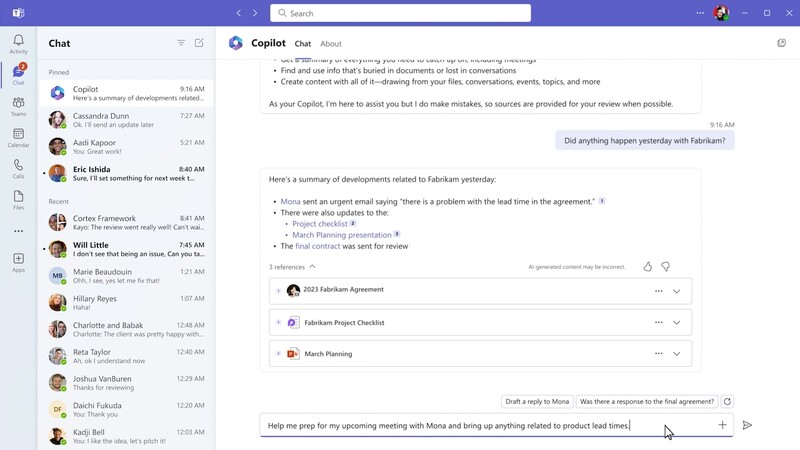 - 팀즈(Copilot in Teams)에서는 코파일럿이 미팅 주요 논의사항을 실시간 요약하거나 놓친 부분을 알려준다. 누가 무슨 말을 했고, 어떤 부분에서 참석자들의 의견이 일치 혹은 불일치했는지 등도 포함된다. 대화의 맥락에 맞게 행동이 필요한 항목도 제안한다.