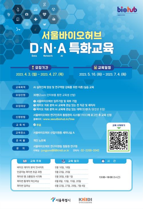 이번 교육은 5월 16일부터 총 7주간(70시간) 실시된다. 수강 신청은 4월 27일(목)까지 서울바이오허브 누리집에서 할 수 있으며, 모집하는 교육생은 총 30명으로 전액 무료다. 교육 수료생 모두에게는 허브의 공용 연구장비 중 하나인 클라우드컴퓨팅시스템(GPU Server) 30일 무료이용권을 제공한다.