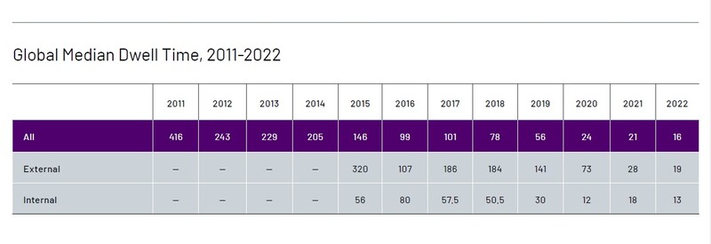 맨디언트가 오늘 ‘2023 M-트렌드 보고서(M-Trends 2023)’를 공개했다. 2023 M-트렌드 보고서에 따르면 공격자가 탐지되기 전 표적의 환경에서 머무는 시간의 중앙값으로 산출되는 전 세계 공격 지속 시간 중앙값은 전년대비 연속 하락해 2022년 16일을 기록했다. 이는 M-트렌드의 전체 보고 기간 동안 기록된 전 세계 공격 지속 시간 중앙값 중 가장 낮은 수준으로 2021년 중앙값은 21일이었다.