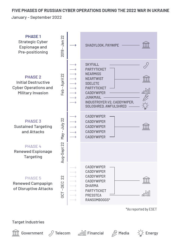 맨디언트는 2022년 2월 24일 러시아의 우크라이나 침공 직전과 그 후 광범위한 사이버 스파이 활동과 첩보 공작을 확인했다. 특히, 러시아의 우크라이나 침공 이전 UNC2589과 APT28의 활동이 포착됐고 직전 8년 대비 2022년 첫 4개월 동안 우크라이나를 표적으로 한 보다 많은 파괴적인 사이버 공격이 관찰됐다.