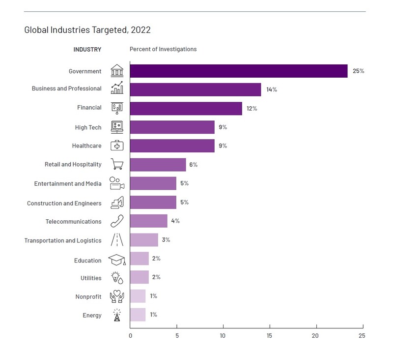 정부 관련 기관 대응이 2021년 9% 대비, 2022년 전체 조사의 25%를 차지했다. 이는 우크라이나를 표적으로 한 사이버 위협 활동에 대한 맨디언트의 조사 지원이 주를 이룬다. 그 외 2022년 가장 많이 표적이 된 4대 산업은 맨디언트 전문가가 2021년에 관찰한 바와 대동소이하며, 비즈니스/전문 서비스, 금융, 하이테크, 의료 순이다. 이들 산업은 금전적 목적, 첩보 활동을 동기로 한 공격자들에게 여전히 가장 매력적인 표적이 되고 있다.