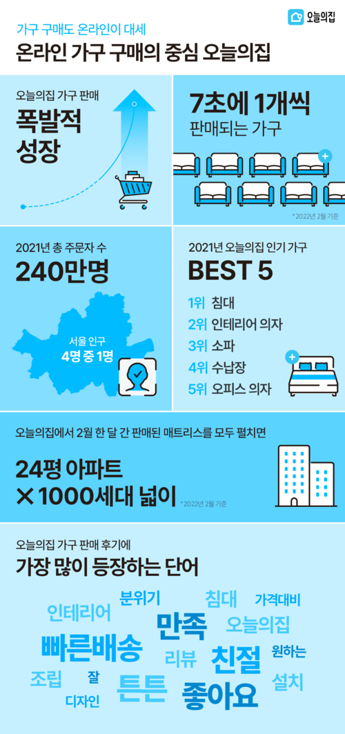 이는 오늘의집에서 가구를 구매한 고객 수에서도 드러난다. 올해 2월 기준으로 매 7초마다 한 개씩 가구 제품이 팔리고 있고, 지난 해 가구를 구매한 고객은 총 240 만명으로, 서울 인구의 1/4에 이르는 숫자다. 올해 2월 한 달 동안 판매된 매트리스를 모두 펼치면 축구장 11개 넓이에 이르고, 24평 아파트 넓이로 환산하면 무려 1000세대 규모 면적에 맞먹는다.