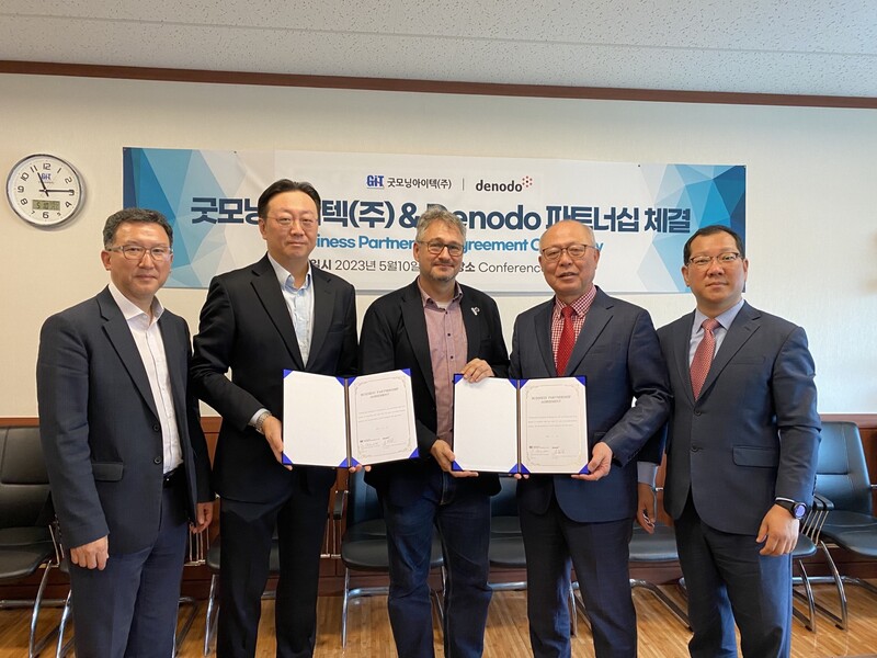 이번 파트너십은 국내 데이터 가상화 시장 확대를 위한 양사의 협력 관계를 구축하기 위한 것으로, 10일 진행된 협약식에는 알렉스 홀(Alex Hohl) 디노도 아태지역 파트너 비즈니스 총괄(Vice President Business Development APAC at Denodo), 남궁명선 디노도코리아 지사장, 강영묵 디노도코리아 파트너 비즈니스 상무, 이주찬 굿모닝아이텍 대표, 김민주 굿모닝아이텍 전무가 참석했다.