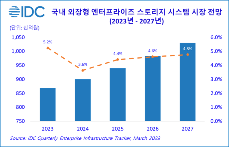 한국IDC((International Data Corporation Korea, 인터내셔날데이터코퍼레이션코리아)는 최근 발간한 '국내 외장형 엔터프라이즈 스토리지 시스템 시장 전망(2023-2027) 보고서'에서 국내 외장형 엔터프라이즈 스토리지 시스템(이하 ESS) 시장은 향후 5년간 연평균 4.5% 성장해 2027년 1조 298억원의 매출 규모를 형성할 전망이라고 금일 밝혔다.