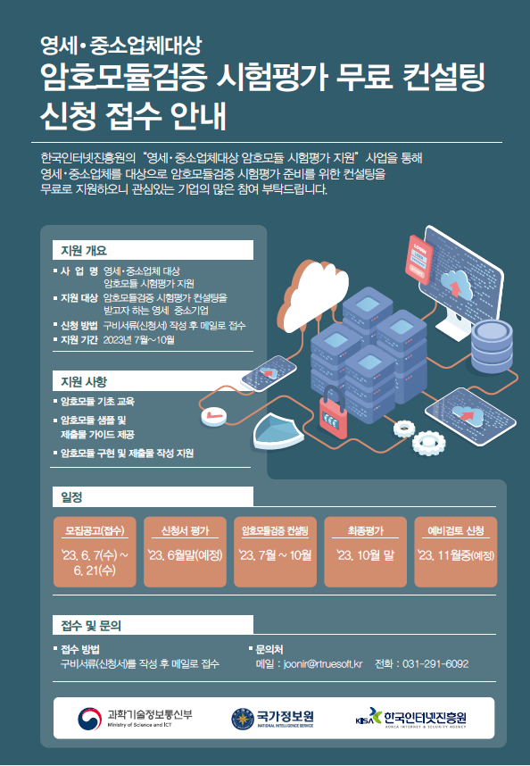 한국인터넷진흥원(이하 KISA)은 과학기술정보통신부, 국가정보원과 함께 암호모듈검증을 준비하는 영세·중소기업을 대상으로 암호모듈검증 시험평가 무료 컨설팅을 6월 7일부터 21일까지 신청받는다고 밝혔다.
