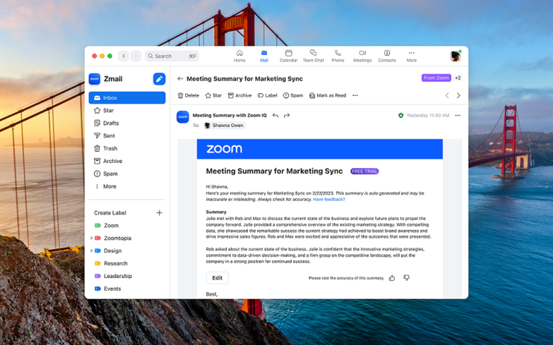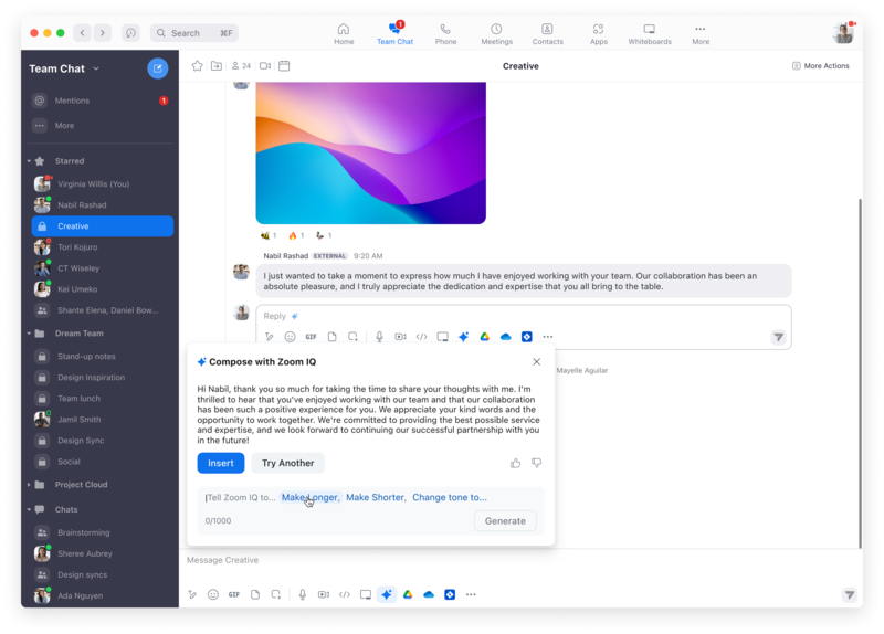 또한 줌 팀챗 사용자는 오픈AI의 기술을 활용하는 AI 작성 기능을 사용해 팀챗 스레드 내용의 맥락을 기반으로 메시지 초안을 작성할 수 있다. 메시지 어조와 길이를 조정하고 응답 문구를 수정해 텍스트 추천을 사용자 지정할 수도 있다.