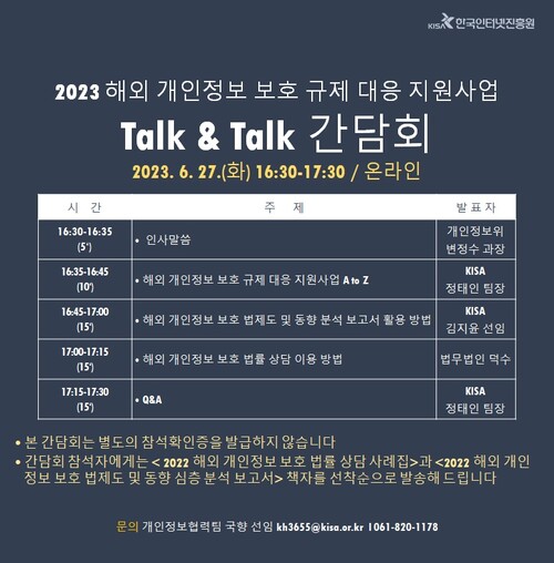 한국인터넷진흥원(KISA, 원장 이원태)과 개인정보보호위원회(위원장 고학수)는 EU, 미국 등 해외 주요 시장에 진출하는 국내 기업을 대상으로 ‘2023 해외 개인정보 보호 규제 대응 지원사업 간담회’를 오는 27일 온라인으로 개최한다고 밝혔다.