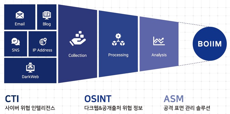 BOIIM은 CTI를 활용해 외부 외부 위협 탐지를 최적화하는 매니지드 보안 서비스로 CTI, 다크웹/OSINT(Open Source Intelligence), ASM(Attack Surface Mangement) 등을 통해 기업이 주의해야 할 주요 위협 동향에서부터, 다크웹 등에 유출된 해당 기업의 주요 데이터를 확인하고 고지하는 등의 서비스를 제공한다. 사실 이는 NSHC가 공공기관에 수사를 위한 정보를 제공하기 위한 기술로 개발된 기술이나, 이를 수사 목적이 아닌 관제 목적으로 개선해 기업전용 관리형 CTI 서비스로 만든 것이다.