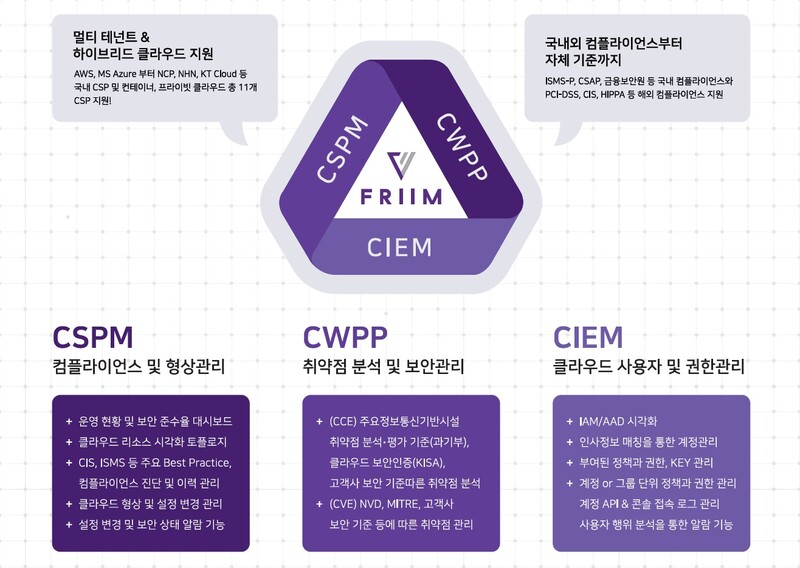 반면 FRIIM은 전형적인 클라우드 앱 보호 기능을 제공하는 CNAPP(Cloud-Native Application Protection Platform) 솔루션으로 클라우드 환경의 각종 자원에 대한 효율적인 보안 관리와 다양한 위협에 대응할 수 있도록 돕기 위한 서비스다. 이 FRIIM은 NSHC가 시커스와 손잡고 조인트 벤처를 설립해 본격적인 시장 진출을 노리고 있는 상황이다. 이를 통해 많은 기업들이 어려워하고 있는 클라우드 보안에 대한 해결방안을 제시해 나갈 예정이다. 특히 FRIIM은 멀티클라우드 환경에 강한 CWPP(Cloud Workload Protection Platforms) 중심의 CNAPP이라는 장점을 앞세워 국내 시장 공략에 나설 예정이다.