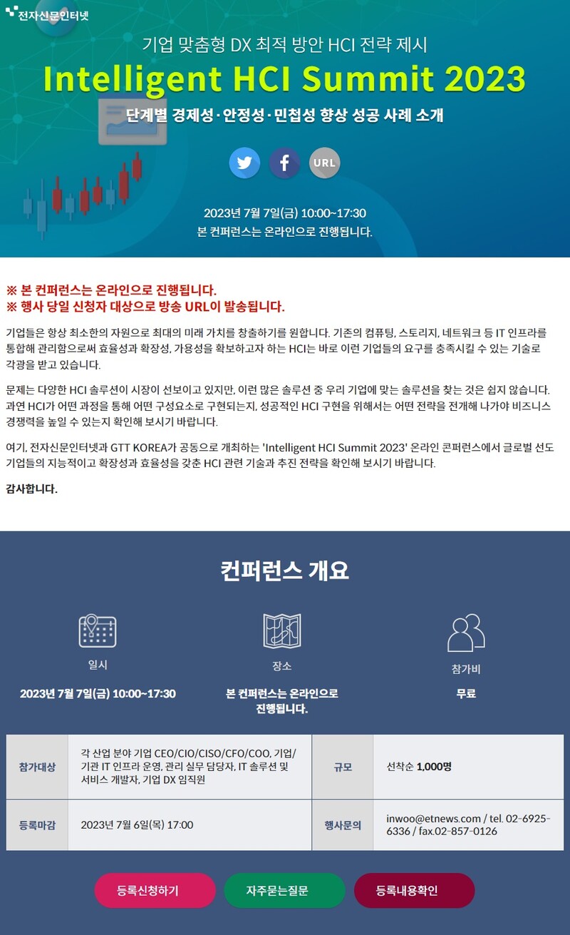 GTT KOREA와 전자신문인터넷이 공동으로 주최하는 무료 온라인 콘퍼런스인 'Intelligent HCI Summit 2023'가 오는 7월 7일 금요일 개최된다.