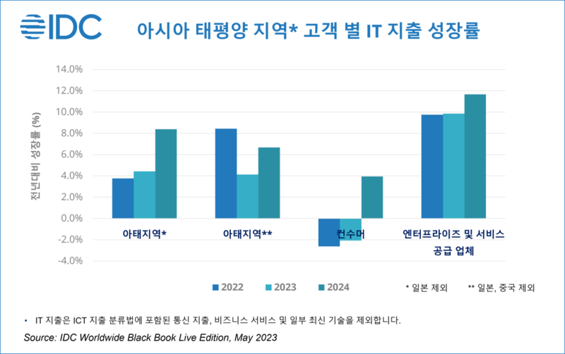 인터내셔날데이터코퍼레이션코리아(International Data Corporation Korea, 이하 한국IDC)가 최근 발표한 '전세계 블랙북: 라이브 에디션(Worldwide Black Book: Live Edition)' 데이터에 따르면, 대내외 불확실성에도 불구하고 일본을 제외한 아시아/태평양 지역의 IT 지출이 2022년 3.8%에서 2023년 4.4% 증가할 것으로 예상된다고 금일 밝혔다. 약화된 경제 전망, 지속적인 인플레이션, 높은 물가로 인해 소비심리와 지출이 직접적인 영향을 받으며 컨수머 기술 지출 전망은 지난 6개월 연속 감소했다. 엔터프라이즈와 서비스 제공업체 기술 지출은 회복세를 보이고 있지만 증가하는 경제적 압력에 직면하며 신중한 모습을 보이고 있는 것으로 나타났다.