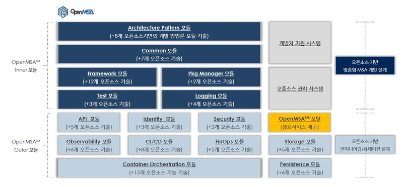 클라우드 네이티브 환경을 만드는 수많은 오픈소스 솔루션을 선정해 고객들이 원하는 방식으로 MSA를 구현할 수 있도록 만드는 것으로 오픈소스 기반 엔지니어링 큐레이션이라고 할 수 있다. 다시 말해 여러가지 기술들을 고객에게 맞춰 설계해주는 것이다. 또한 여기에 사용할 모듈이나 프레임워크를 고객이 직접 셀프서비스로 클릭해서 선택하고 구현할 수 있도록 포털을 통해 제공할 수 있도록 만들고 있다.