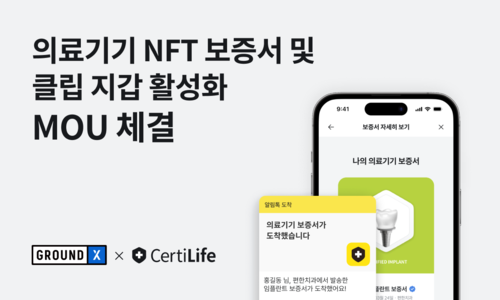 의료기기 보증서 플랫폼 스타트업인 서티라이프(대표 김도희)가 지난 10일 카카오 블록체인 기술 계열사 그라운드엑스(대표 양주일)와 NFT 의료기기 보증서 확대 및 디지털 자산 지갑 ‘클립’ 활성화를 위한 협약을 체결했다고 12일 밝혔다.