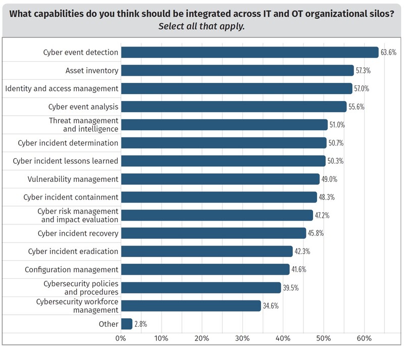 IT와 OT 사일로 간 통합이 가장 요구되는 기능으로는 사이버 이벤트 탐지(63%)가 꼽혔으며, 자산 인벤토리(57%)와 ID와 액세스 관리(57%)가 그 뒤를 이었다. 근본 원인을 파악하고 잠재적인 운영 방해 리스크를 예방하기 위해서는 IT와 OT 환경 전반에서 이벤트를 탐지할 수 있는 역량이 가장 중요하다.