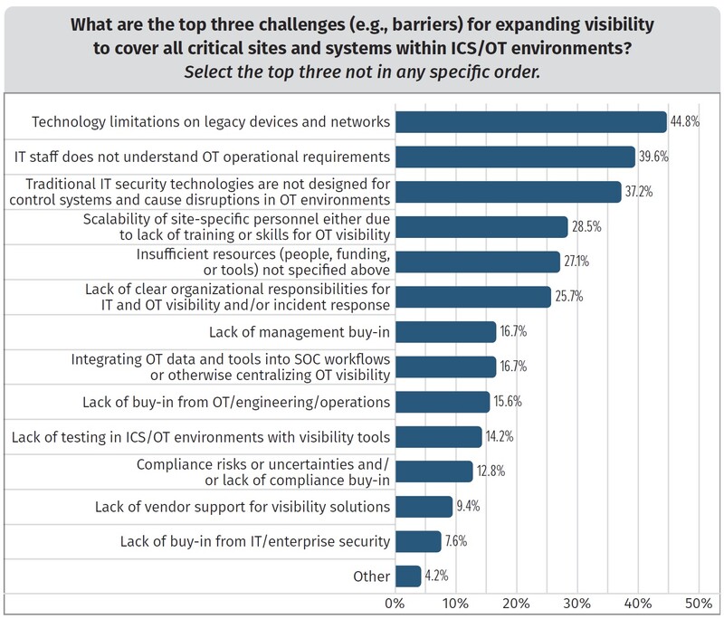 레거시 기술 또한 OT 보안운영 가시성을 확장하는 데 있어 주요 장애물로 지목됐다. 레거시 디바이스와 네트워크의 한계(45%)와 OT 환경에 맞게 설계되지 않은 IT 기술(37%)이 IT 직원의 OT 지식 부족(40%)과 함께 3대 과제로 꼽혔다.