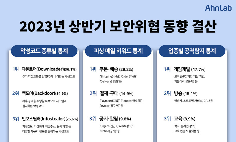올해 상반기에는 공격자가 추가 공격 수행을 위해 주로 사용하는 악성코드인 ‘다운로더’와 '백도어’가 각각 1, 2위를 기록한 가운데 정보유출형 악성코드인 ‘인포스틸러’가 뒤를 이었다.