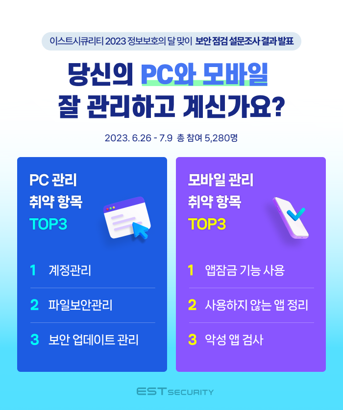 보안 전문 기업 이스트시큐리티는 7월 '정보보호의 달'을 맞아 진행한 '대국민 PC·모바일 보안 점검 설문조사' 결과를 공개했다.