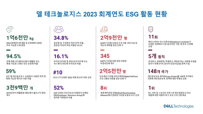 델은 기후 변화, 순환 경제 가속화, 포용적인 업무 환경 조성, 디지털 격차 해소 등의 다양한 사회적 과제를 해결하기 위한 파트너십과 프로그램에 지속적으로 투자해 왔다. 특히 지난 2019년, 생산하는 제품의 절반 이상을 재활용이 가능하거나 재생 가능한 소재로 생산하겠다는 '2030을 향한 목표(2030 Moonshot Goals)'를 수립한 이래, 혁신적인 기술과 아이디어로 이 약속을 실천해왔다. 이번에 발표한 ‘2023 회계연도 ESG 연례 보고서’에서는 현재까지의 ESG 활동 성과와 2030년 이후 새롭게 집중할 분야와 구체적인 목표를 제시하고 있다.