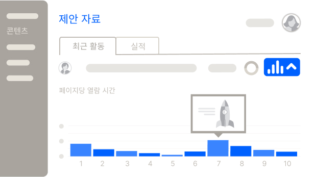 독센드의 애널리틱스 기능은 공유 자료 열람자의 반응에 대한 주요 인사이트를 제공한다. 사용자는 이를 기반으로 적합한 타깃 선별, 선제 대응, 최적화된 액션을 실행해 성과를 극대화할 수 있다.독센드가 제공하는 열람자의 반응과 선호도에 대한 인사이트는 풍부한 미디어와 영상 자료를 결합해 설득 대상에게 간결하고 설득력 있는 스토리를 전달할 수 있도록 지원한다.