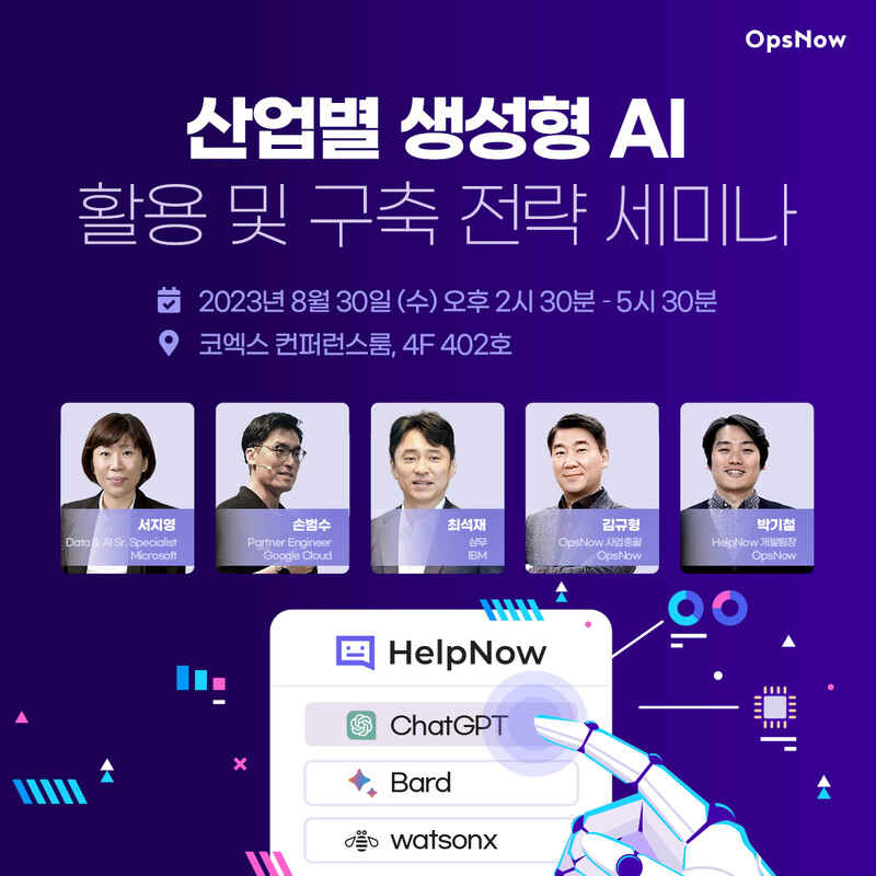 멀티 클라우드 관리 플랫폼 기업 옵스나우(OpsNow)가 오는 30일 코엑스에서 ‘산업별 생성형 AI 활용 및 구축 전략 세미나’를 개최한다고 16일 밝혔다.