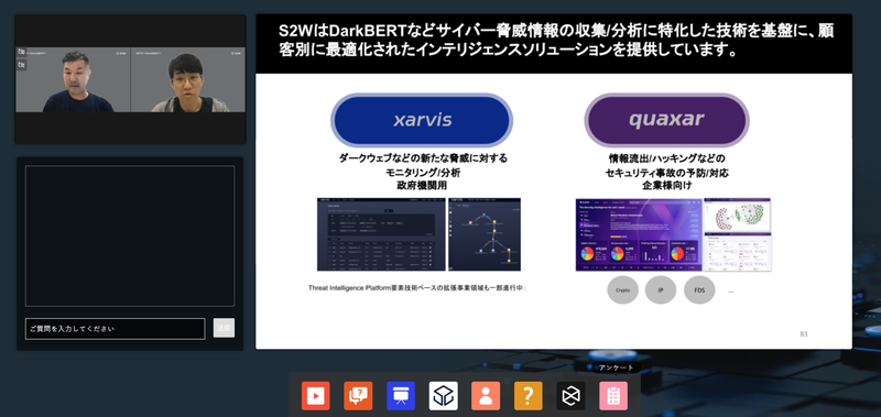 웨비나는 일본내 S2W의 기술과 솔루션에 관심을 보이는 잠재 고객과 파트너사를 대상으로 개최됐으며, NEC, KPMG, 소프트뱅크 등 일본 내 약 20개사에서 참여해 S2W의 솔루션 사례와 다크버트의 활용도에 대한 관심을 보였다.