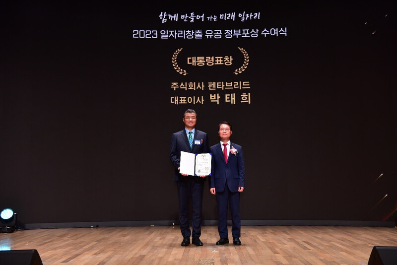 디지털마케팅 플랫폼 종합광고기업 펜타브리드의 박태희 대표이사가 신규 일자리 창출과 고용시장 활성화에 기여한 공로를 인정받아 지난 9월 4일 열린 '2023년 일자리창출 유공 정부포상' 개인부분에서 대통령 표창을 수상했다고 밝혔다.