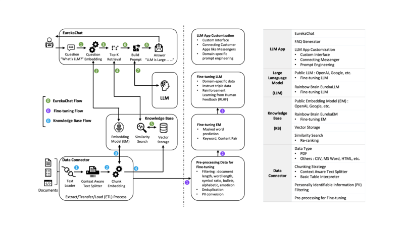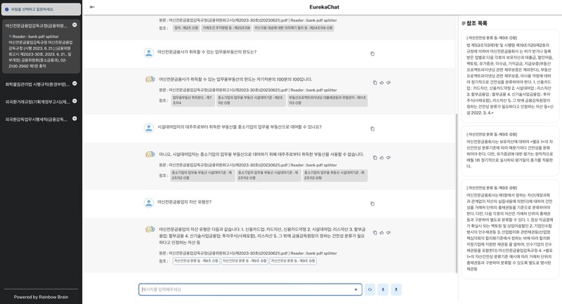 레인보우브레인의 유레카챗(EurekaChat)은 기업 내에 보유하고 있는 정형, 비정형 데이터를 이용해 자동으로 LLM이 이해할 수 있는 데이터베이스를 구축하고, 사용자의 자연어 질의를 받아 가장 연관이 높은 문서의 해당 부분을 찾아서 생성AI로 요약해서 보여주는 솔루션이다.