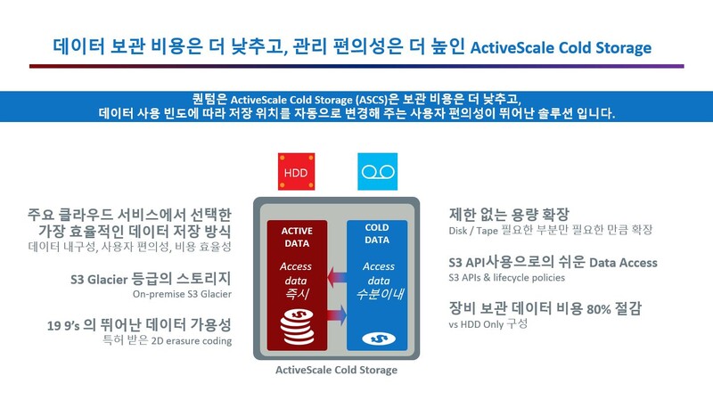 퀀텀은 액티브스케일 콜드 스토리지는 콜드 데이터 보관에 최적화된 안전하면서도 내구성과 경제성이 우수한 오브젝트 스토리지다. 페타바이트(PB) 단위 이상의 데이터를 생성하는 모든 기업들은 이 제품을 통해 자체 데이터센터, 코로케이션 시설 또는 서비스형 IT 환경 내에 S3 글래시어 클래스 스토리지를 구축할 수 있으며, 전체 시스템을 직접 구축하거나 풀 매니지드 서비스 등 원하는 대로 구축할 수 있다.