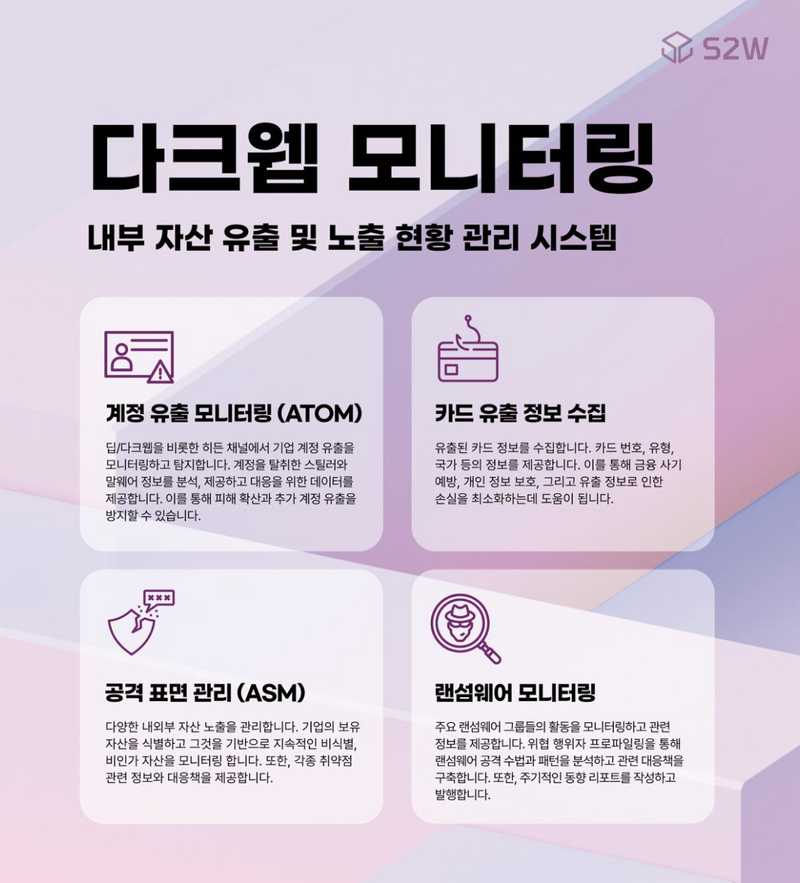 금융권에서 불법 탈취된 정보와 악성코드 등 자료들의 대다수가 다크웹에서 유통되기 때문에 금융권에서 다크웹 모니터링과 다크웹에 대한 대응 강화 필요성이 지속적으로 제기돼 왔다. 실제로 S2W가 보유하고 있는 금융권 데이터 유출과 랜섬웨어 정보는 전체의 30%에 이르고 있다.