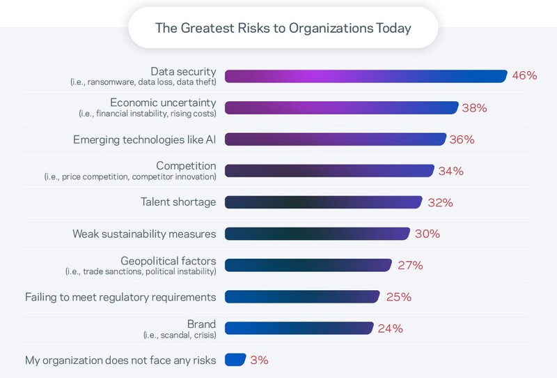 보고서에 의하면 응답자들은 자신이 속한 기업 혹은 기관이 직면한 가장 큰 위험 요인으로 ‘데이터 보안’(46%, 한국 36%), ‘경제적 불확실성’(38%, 한국 35%), 인공지능(AI) 등 ‘신기술’(36%, 한국 36%)을 꼽았다. 한국 응답자들의 경우, ‘지속 가능한 비즈니스 운영을 위한 조치 미흡’(35%)과 ‘컴플라이언스 실패’(29%) 또한 큰 위험 요인으로 꼽았다.