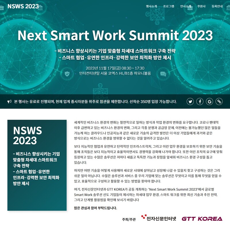이번 “NSWS 2023”에서는 총 20개 세션과 전시 부스를 통해 전세계 스마트워크, 협업 기술과 시장을 이끌고 있는 글로벌 리더 기업들이, 급변하는 기술과 비즈니스 환경에서 차세대 업무 환경, 스마트워크를 위한 최신 기술과 추진 전략, 그리고 단계별 활용법을 공유한다.