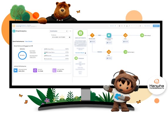 실제로 한화호텔앤드리조트는 세일즈포스 마케팅 클라우드를 활용해 고객의 예약, 투숙, 시설 이용, 체크아웃을 포함한 모든 여정 간의 다양한 데이터를 통합하고 분석한다. 이를 통해 고객의 관심사와 선호도를 파악하고, 이를 기반으로 개인화된 마케팅 캠페인을 실행할 수 있다. 또한, 한화호텔앤드리조트는 고객 여정 전반을 옴니채널 상에서 추적, 관리할 수 있는 환경을 구축함에 따라 고객의 선호 채널에 맞춰 보다 향상된 고객경험을 제공할 수 있게 됐다.