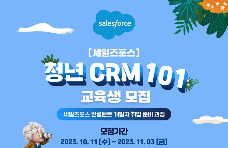 이번 ‘청년 CRM101’ 교육 프로그램 참가자들에게는 클라우드 CRM의 기초부터 개발자, 관리자를 위한 심화 과정까지 심도 있는 IT 관련 기술과 인사이트를 습득할 수 있는 기회가 주어진다. 이 교육은 올해 12월부터 내년 4월까지 약 4개월간 진행되며, 2025년 이전 졸업 예정이거나 미취업자라면 누구든지 지원할 수 있다. 이달부터 진행중인 지원자 모집은 오는 11월 15일 마감 예정이며, 서류전형과 면접전형을 거쳐 최종 합격자를 발표한다.